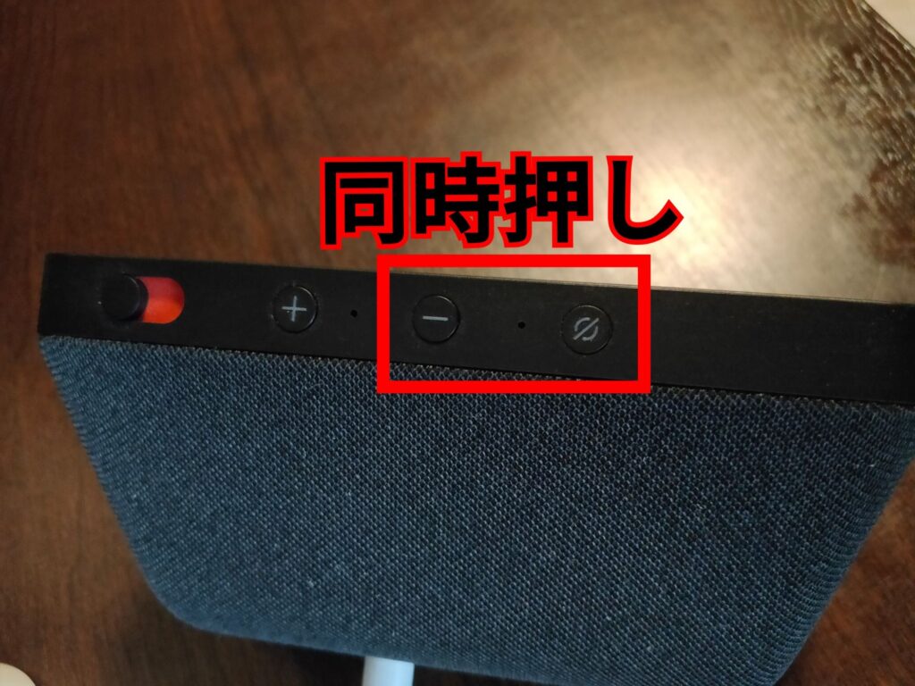 押し込むボタンは「ミュート」と「音量ダウン」です。電源が入っていない状態から押し込みます。