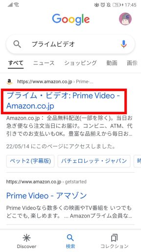 検索文字を「プライムビデオ」と入力して検索すると、最初に表示される「プライム・ビデオ:PrimeVideo-Amazon.co.jp」の項目をクリック(タップ)してページを開きます。