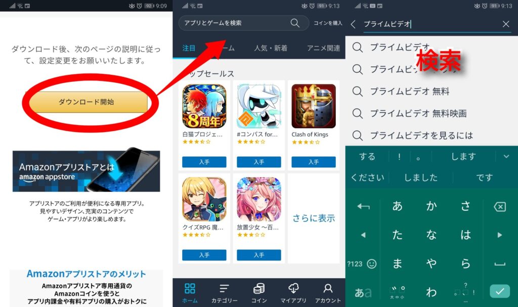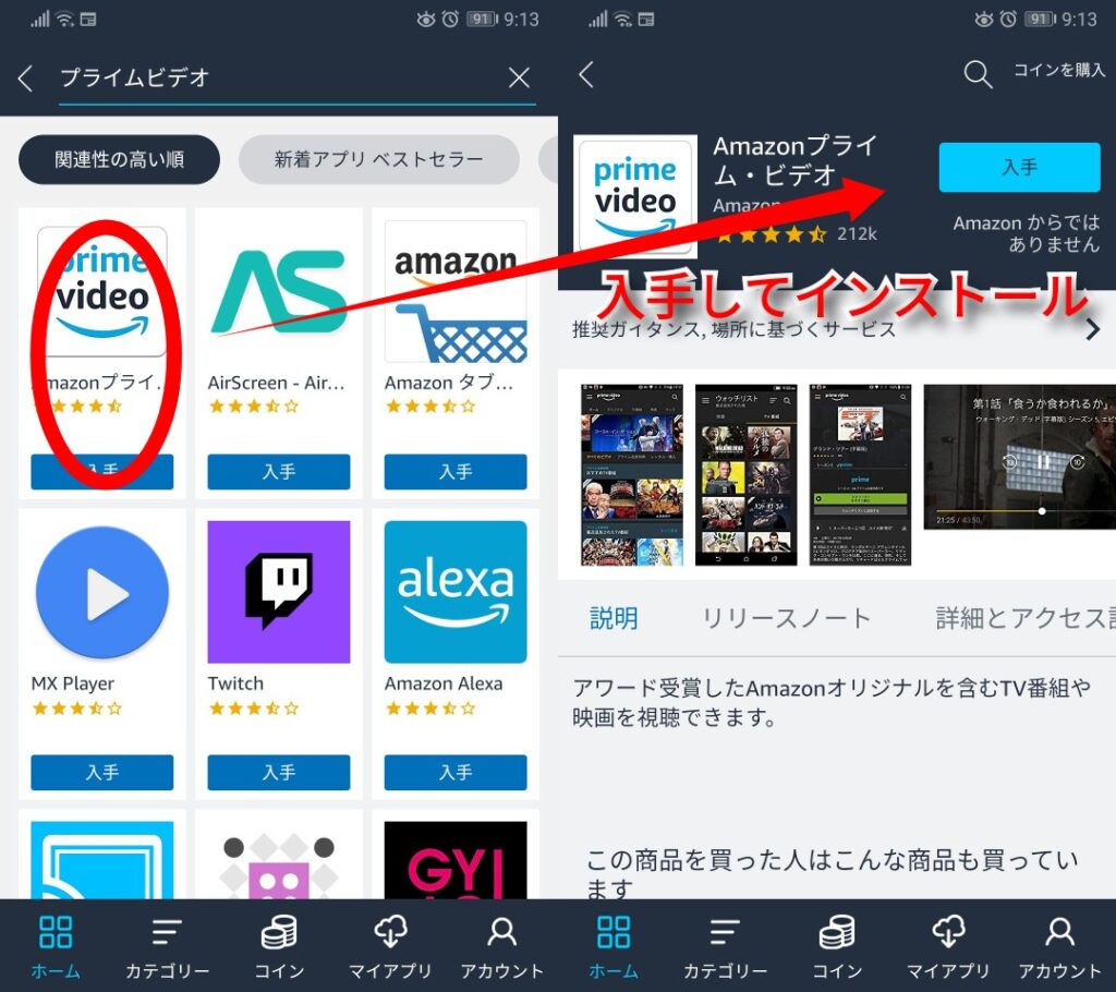 結果からプライムビデオを選択して、「入手」で購入処理が完了したら、インストールをタップして開始します。