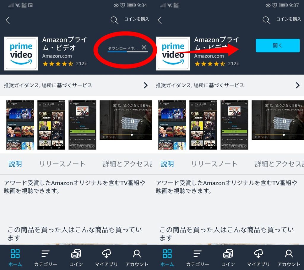 インストールが完了したら「開く」でプライムビデオアプリを開いて購入画面を確認します。