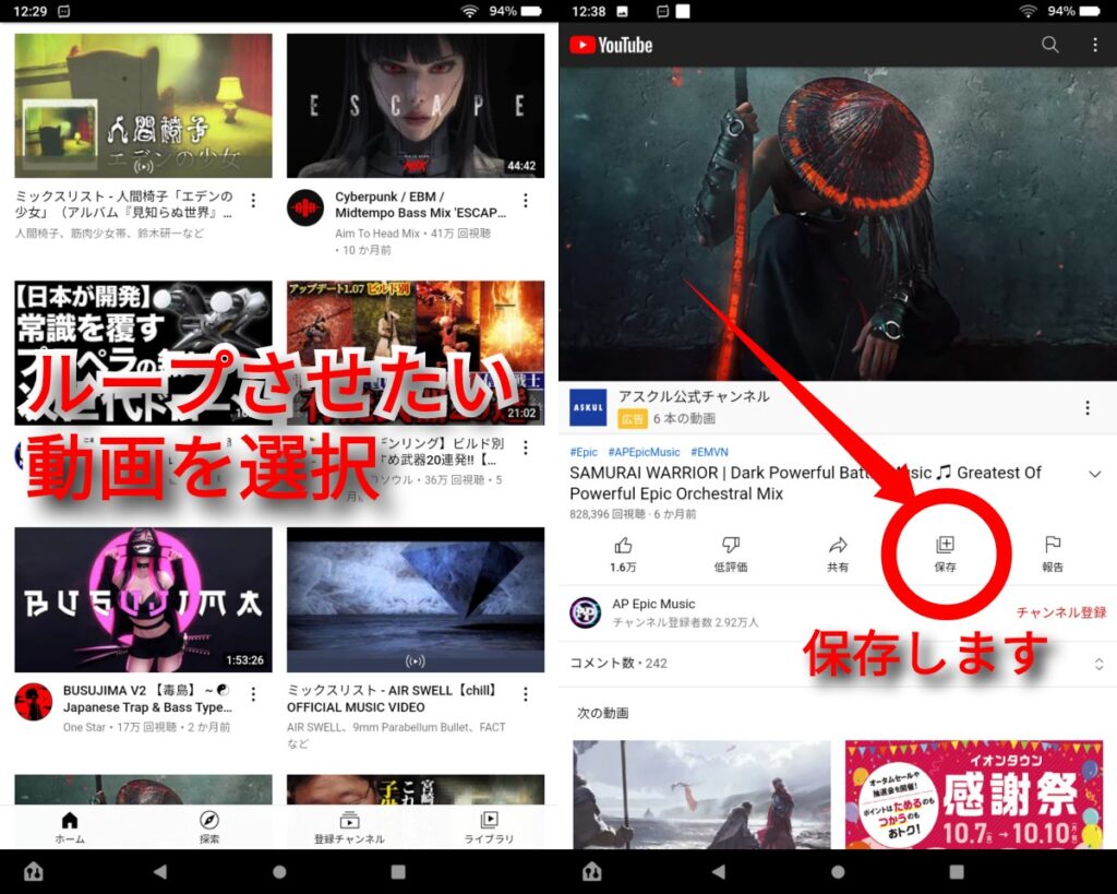 まず、Youtubeのアプリでループしたい動画を選び、「保存」をタップします。