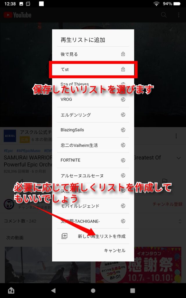 次に表示される「再生リスト」に、ループさせたいリストを作成して追加するか、すでに作成されているリストを選びます。