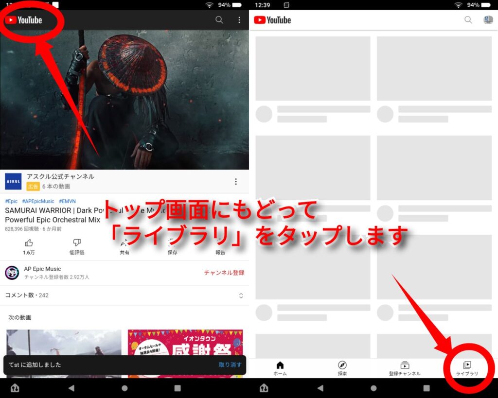 「Youtube」のアイコンからトップ画面にもどって、右下の「ライブラリ」をタップして表示します。