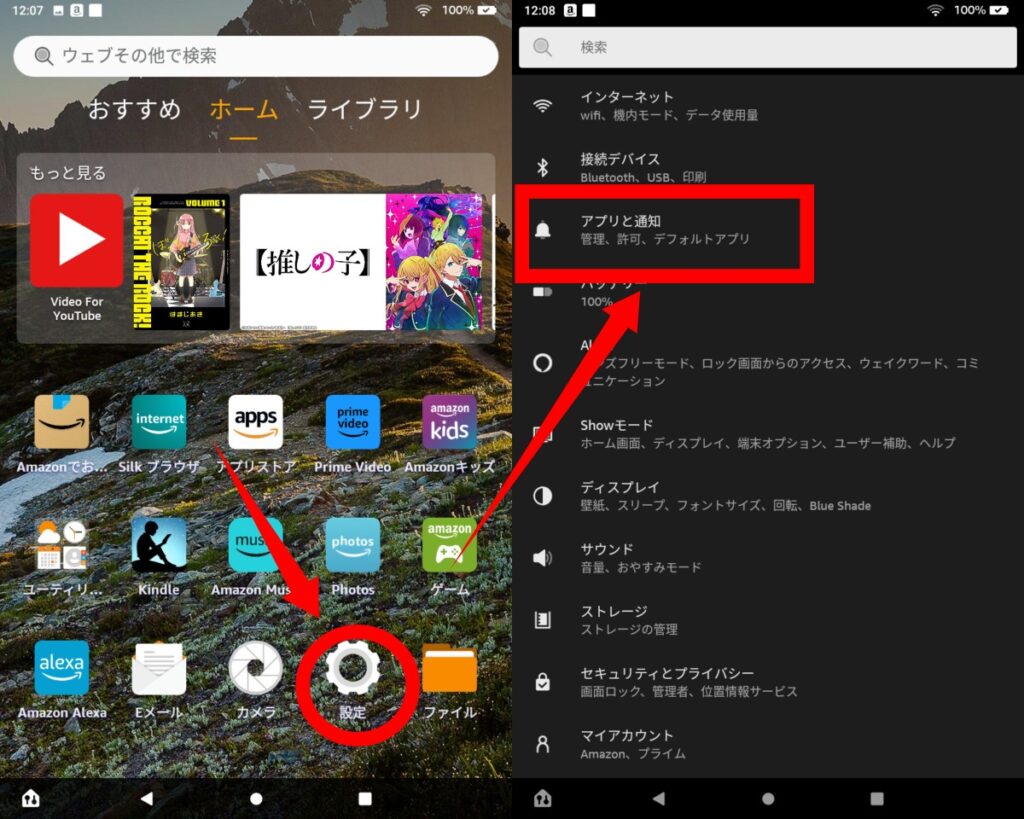 まずはFire タブレットの「設定」アプリを開いて、「アプリと通知」を選択します。