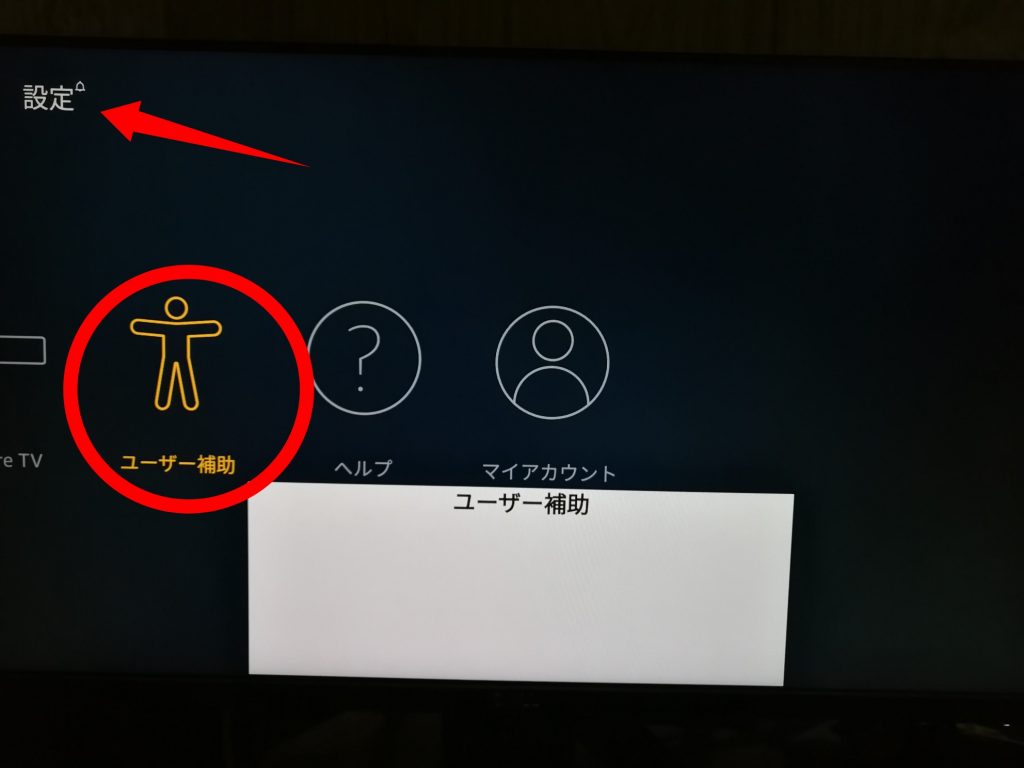 リモコンのHOMEボタンを長押ししても設定メニューを呼び出せますのでお好きな方法でユーザー補助までたどり着きましょう。
