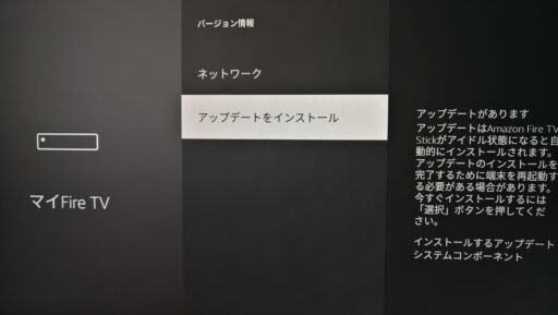 ホーム画面から「設定」>>「マイFire TV 」>>「バージョン情報」のページからアップデートをチェックしたり、インストールを行えます。