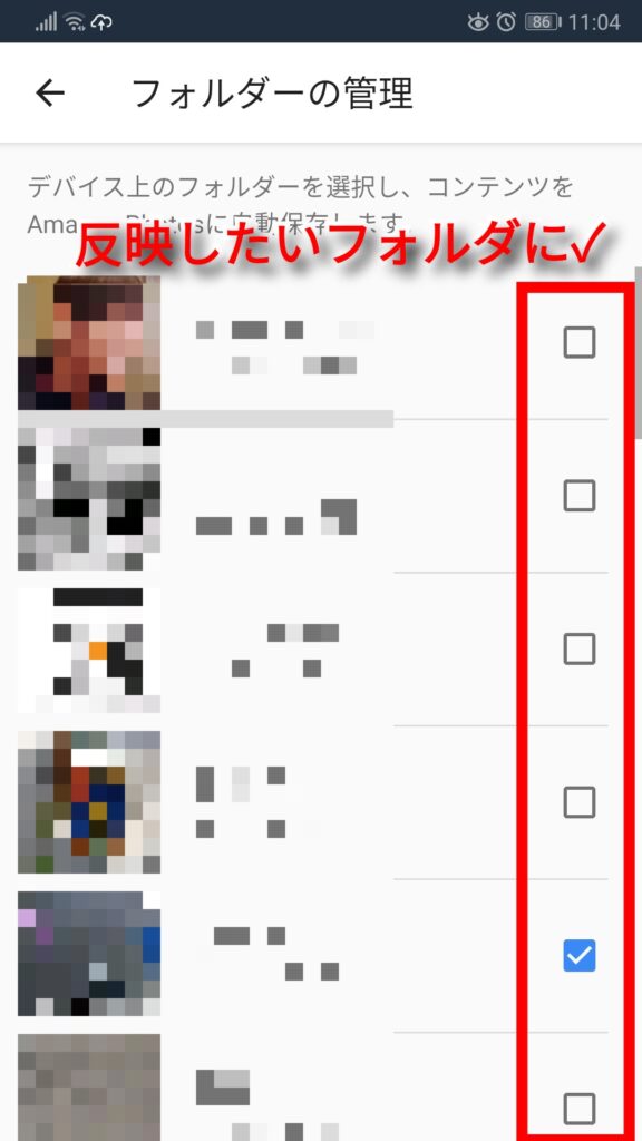 するとスマートフォン上で管理されている写真フォルダが表示されるので、反映させたいフォルダにチェックを入れて有効化させます。