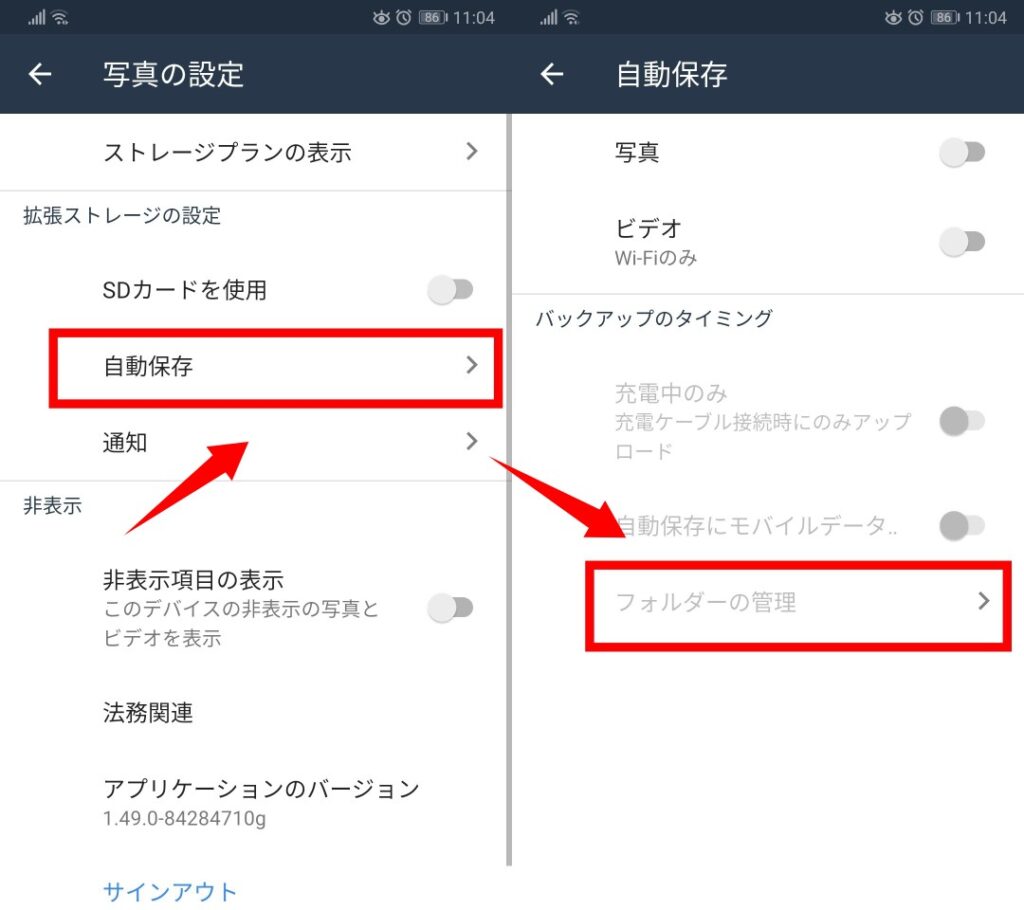 次に「自動保存」をタップして「フォルダーの管理」をタップします。