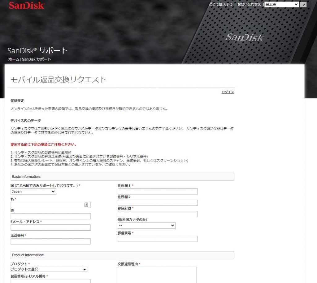 実際に故障したときに「交換申請」を行うときのフォーマットです。入力方法が日本的ではなくアメリカ的な印象をうけますので少し戸惑うかもしれません。