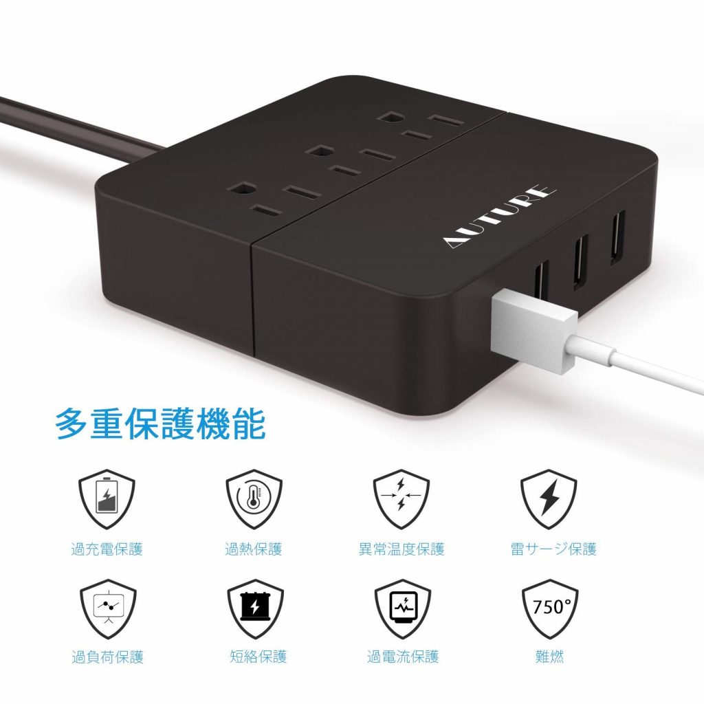 過充電、過熱、雷、負荷、短絡、過電流、燃えにくい構造などなど、タップそのものの安全設計ぶりがハンパないです。