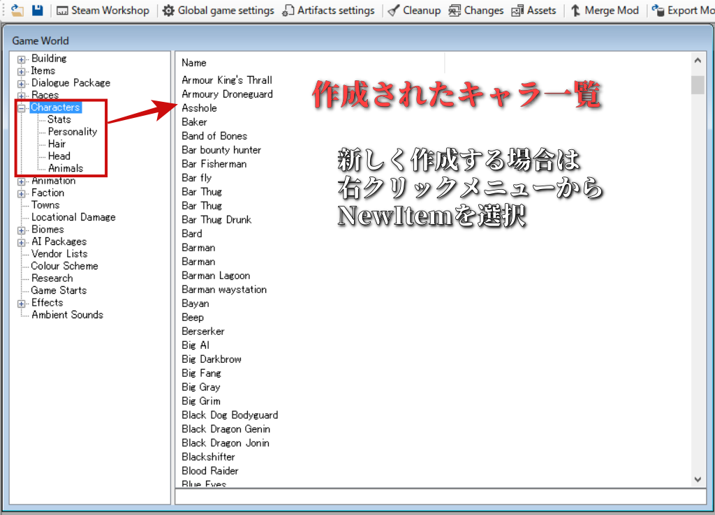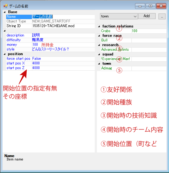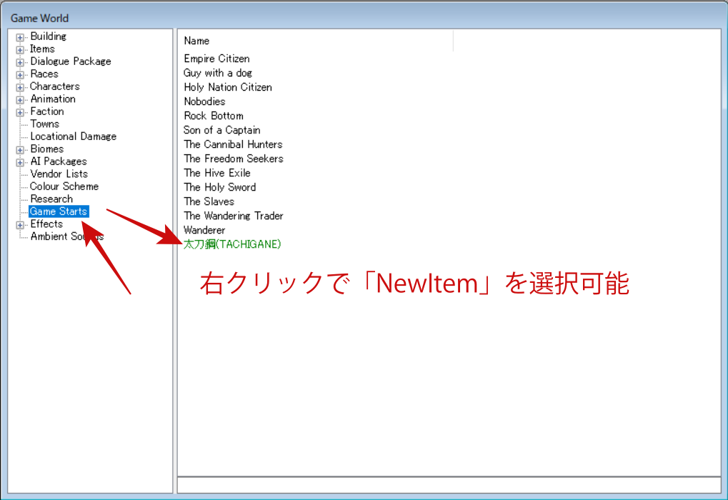 ゲームスタート時の項目を追加する – Kenshi 日本語wiki – アットウィキ にも説明がありますが、GameWorldウインドウからGameStarts項目を選択し、新しいストーリーを作成していきます。