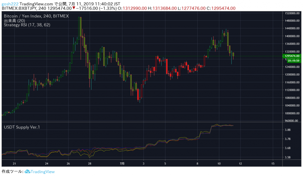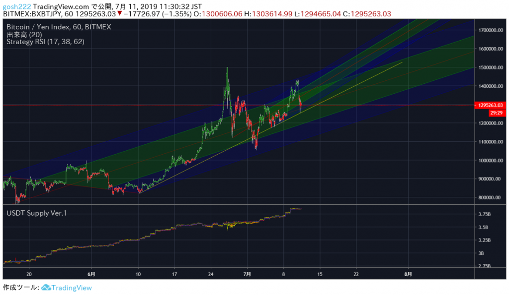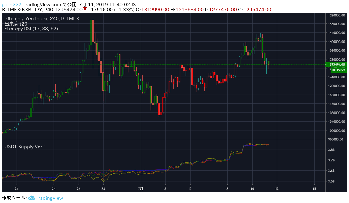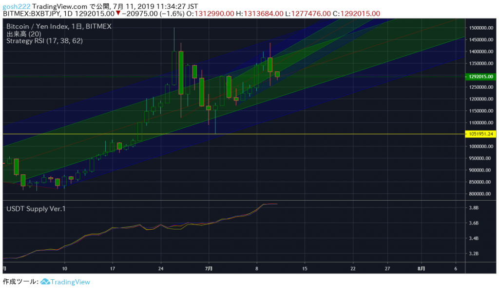 日足としてはこのあたりで一度陽線をつけて緩やかな傾斜に向かうところか。エリオット波動を考慮するとしても6割程度は戻しそうな動き。6割どころかどんどん戻してATHを軽く抜き去ってしまう可能性も大いに考えられるが(USDTの発行推移として)、反落のリスクは最小限に抑えておきたいところ。
