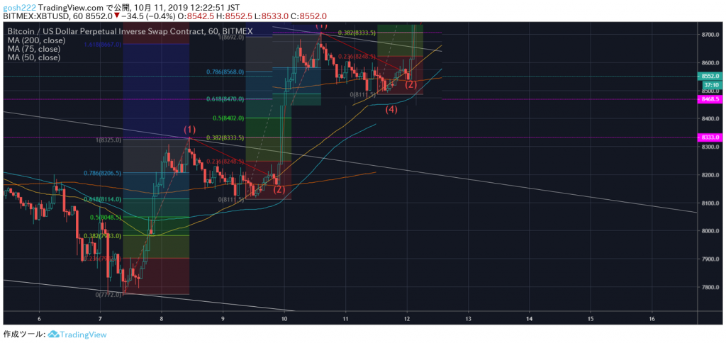上昇波のなかの下降波。❶まで下げてくるのか、もしくは38%ラインで再び上げ始めるのかでエントリが変わる。
