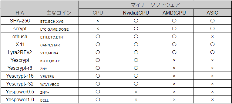 なお、一つのコインの中に複数のHA(=ハッシュアルゴリズム)を採用しているコインもあります。その場合は、仕様上のどのアルゴリズムでも採掘できるようになっています。
