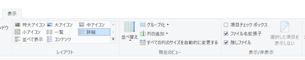 【AppData】フォルダは基本設定が非表示なので、ウインドウの「表示」タブから「隠しファイル」にチェック☑を入れて表示させます。
