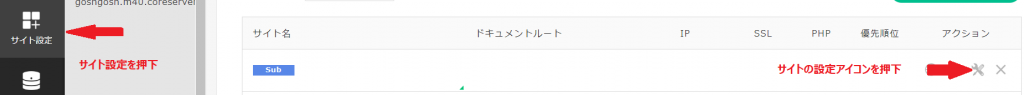 まずはメニューの「サイト設定」から、SSLへと変更したいサイトの「設定アイコン(スパナのマーク)」をクリックします。