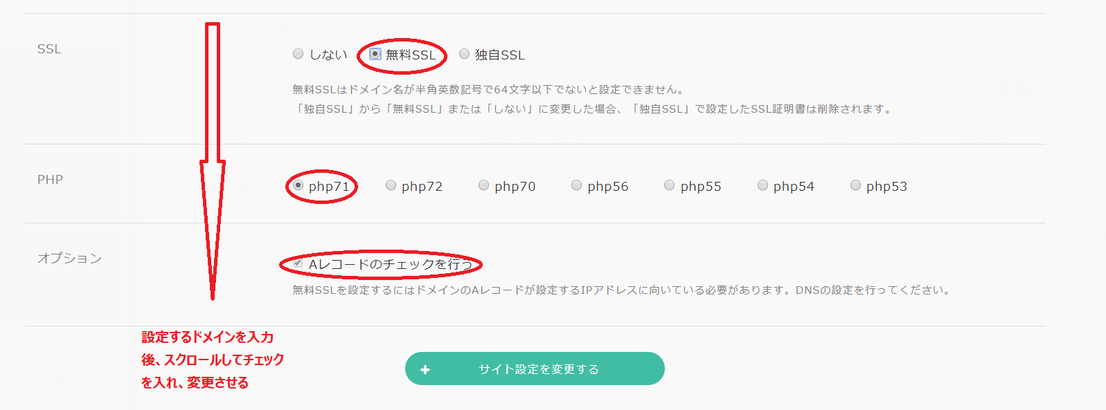 表示されたサイトの設定画面より、まずはSSLを実装するサイトのドメインを入力後、下にスクロールさせて上図のチェックを入れ、変更します。
