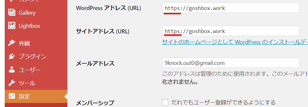 続いてあなたのサイトのWordpressのメニューを開き、「設定」をクリックして、上図の二か所のアドレスを「HTTPS」に書き換えて変更します。